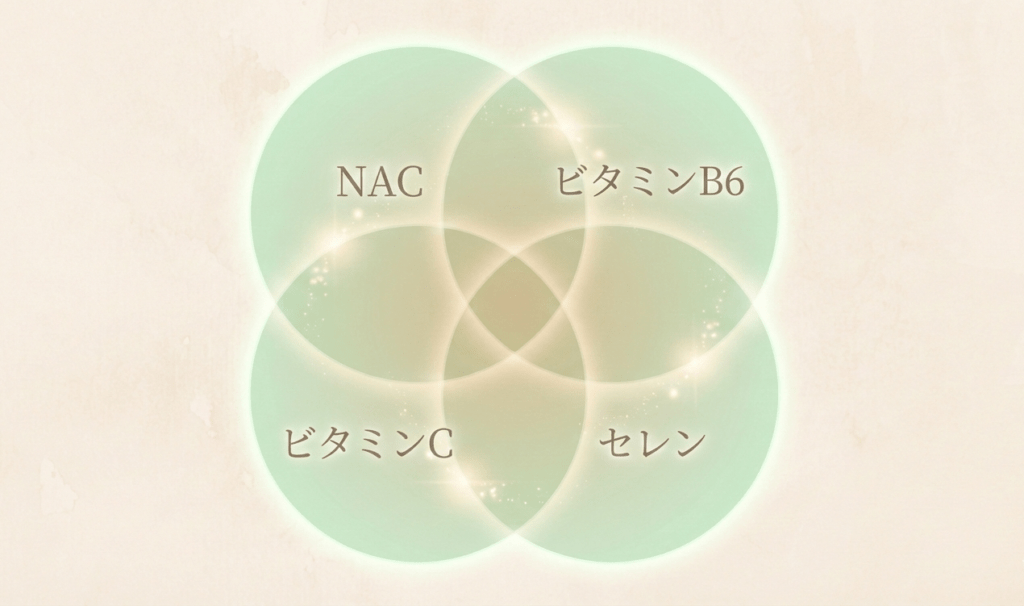 • ビタミンB6:アミノ酸代謝をサポートし、グルタチオン合成に必要なシステインの代謝にも間接的に関与する成分