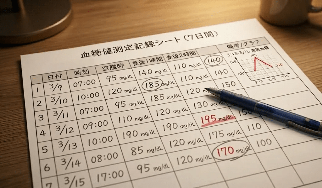 「食後の血糖値を測定しましたが、スパイクはありませんでした。他に考えられる原因を検査してください」と伝えれば、医師も次の検査を進めやすくなります。