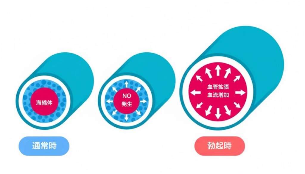 なかでも、EDの最大90%が血管性EDに関係しています※1。本来、正常時は性的刺激を感じると、脳が神経伝達を行い、男性器の内部にある海綿体へ大量の血液が流れこむことで勃起を維持します。