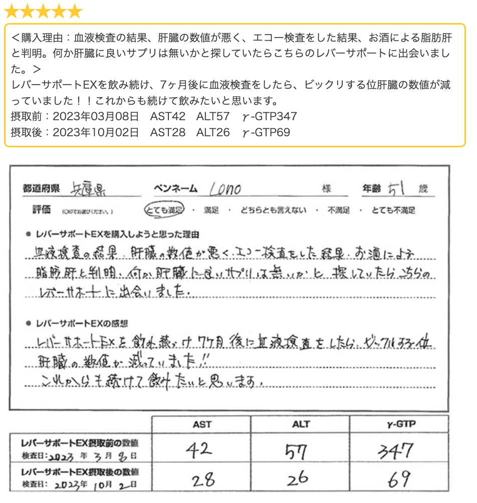 A. レバーサポートEXでは、AST 161→37、ALT 58→22、γ-GTP 175→74(3ヶ月後)、AST 49→30、ALT 35→21、γ-GTP 119→38(5ヶ月後)などの具体的な数値改善が報告されています。ただし個人の感想であり、効果には個人差があります。本製品は医薬品ではなく栄養補助食品です。