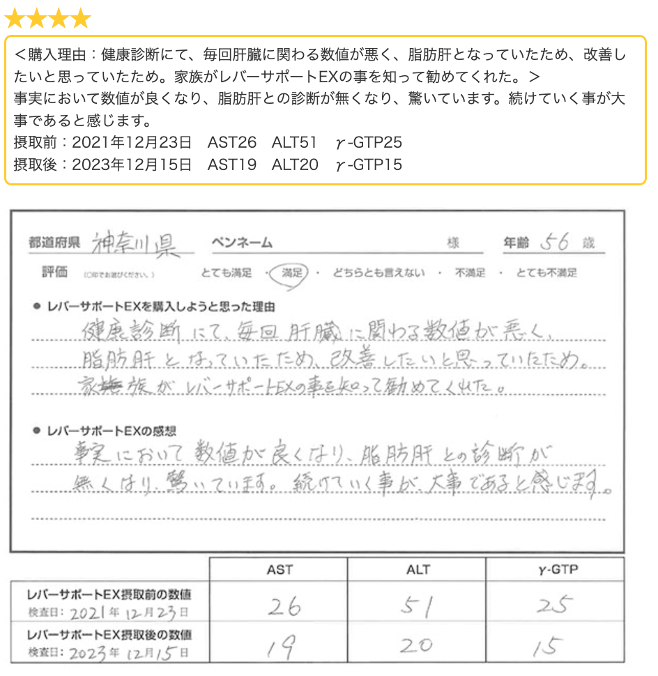 A. レバーサポートEXの利用者からは「医師も驚く数値改善だった」「数値が下がっていて医師に何をしたか聞かれた」という報告が寄せられています。ただし本製品は医薬品ではなく栄養補助食品であり、自己診断を目的としたものではありません。医師の診断と治療に代わるものではなく、医療行為の補助として使用することをお勧めします。現在治療中の方は必ず医師にご相談のうえ、指導に従って生活習慣改善と併用してください。