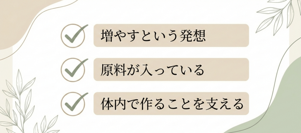 A. 食事や生活習慣に気をつけたり、サプリで補うことで増やせる可能性があります。ただし「取ればOK」と短絡的に決めると「なかなか自分に合うものに出会えない」と遠回りになることもあります。まずは自分の目的に合う選び方の基準を押さえておくと安心です。