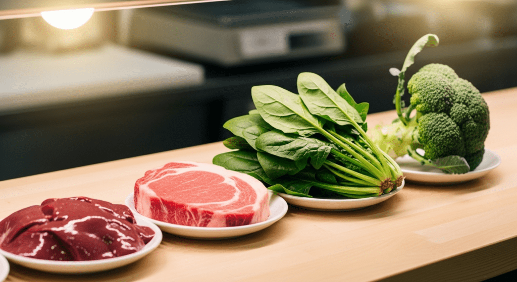 たとえば レバー、赤身の肉、ほうれん草などの野菜が候補に挙げられます。