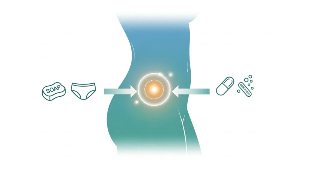 外側のケア(専用ソープ・下着の見直し)と内側のケア(体の内側から膣内環境をサポート)の両方を組み合わせることが最も効果的です。外側だけのケアでは膣内の善玉菌には届かないため、根本的な解決にならないことがあります。