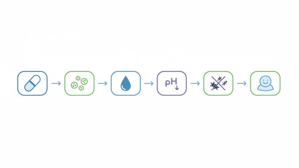 A. 善玉菌「デーデルライン桿菌」を直接補うことです。善玉菌を補うことで乳酸の産生が増え、膣内を弱酸性(pH3.8〜4.5)に保てます。正しい洗い方や生活習慣の改善も大切ですが、これだけでは善玉菌を「増やす」ことはできません。フェミプロバイオは、膣内に存在する善玉菌を5種類230億個配合しており、1日1粒飲むだけで減ってしまった善玉菌を補い、pHバランスを整えることができます。
