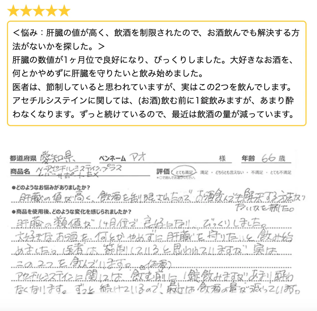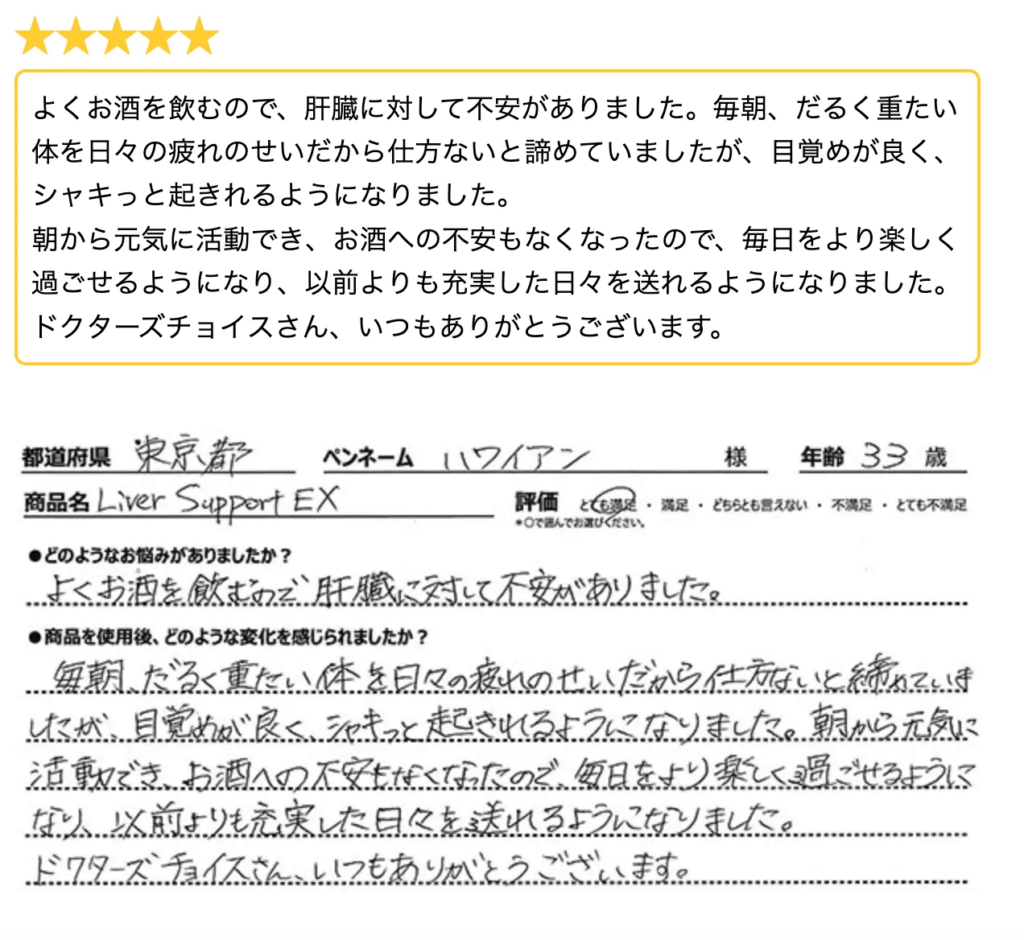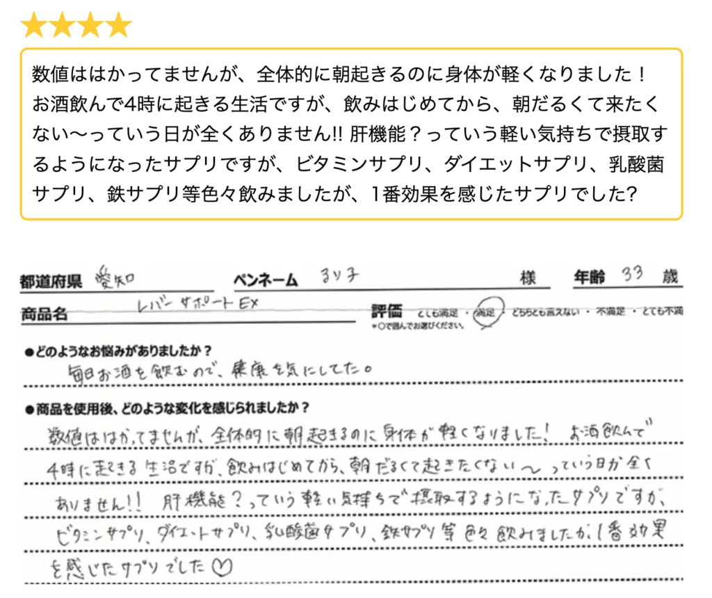 「4ヶ月で数値がびっくりする位下がりました。ほとんど2日酔いもありません。」 - Cさん:「レバーサポートEXを飲みはじめて1ヵ月位してから疲れがあまり感じられなくなって、調子がよくなったような気がします。」