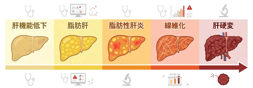医学的なデータは明確です。肝機能低下が続くと、脂肪肝・肝炎・肝硬変へ進行するリスクが高まります。