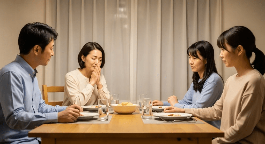 家族の表情が、一瞬曇る。