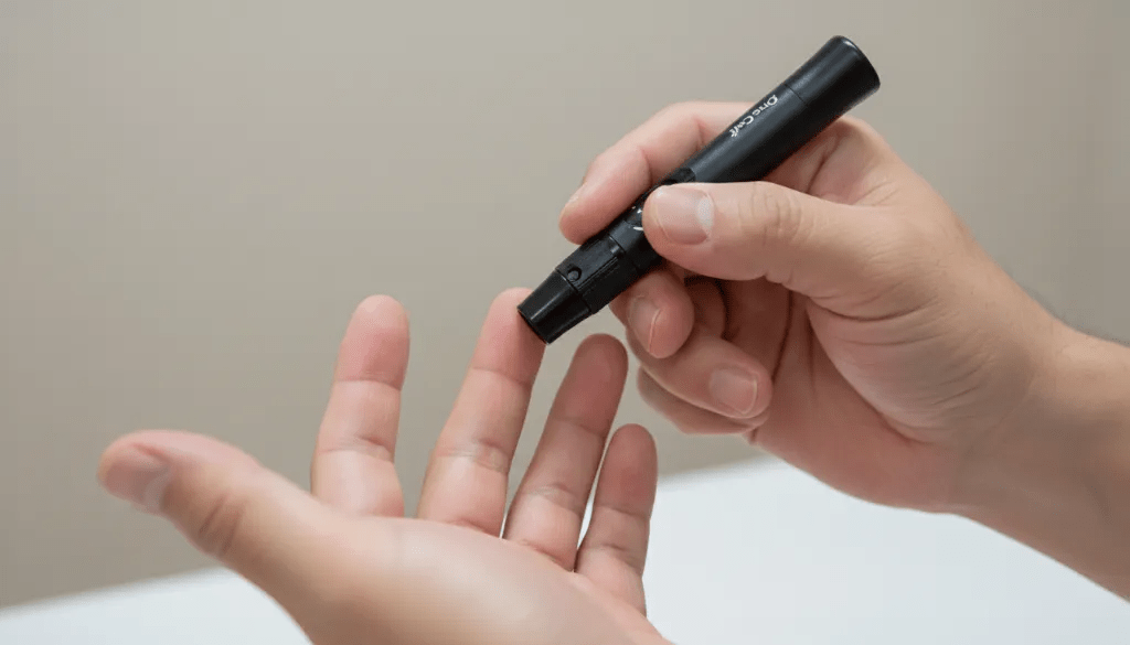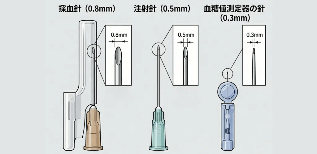 はい、ほとんど痛みはありません。実際に多くの方が「全然痛くない」と答えています。測定器の針は、病院の採血針とは全く異なります。針の太さは約0.3mm(採血針0.8mmの約3分の1)、長さは約1.5mm(採血針25mmの約16分の1)、刺さる深さはわずか1mmです。