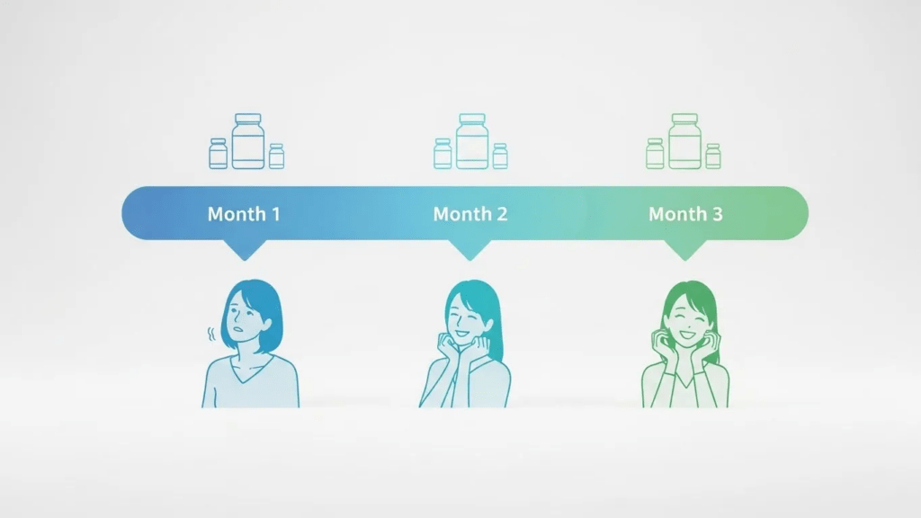 個人差がありますが、多くの利用者から「1ヶ月〜3ヶ月で変化を感じた」との声が寄せられています。特に、体質・ホルモン型やストレス・疲労型の方は、抵抗力を高めるために最低3ヶ月の継続が推奨されています。生活習慣型の方は、比較的早く(数週間〜1ヶ月)変化を感じる傾向があります。